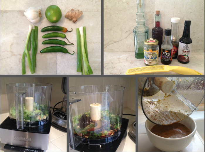 The chef who created this sauce was inspired by a trip to Ayuthaya, the ancient capital of Thailand. He relates that there is an old Buddhist temple amid popular ancient ruins. At the entrance of the temple, barefoot cooks grill small bites of marinated chicken over open flames, providing visitors a mid-morning snack brimming with the magical flavors of garlic, chilies and lime. And I can relate that once I tried this amazing sauce {years ago}, I immediately gave up what we Americans know as barbecue sauce. Absent here are the familiar sweet flavors brought on by ketchup and brown sugar or molasses. Instead there is an exotic base of hoisin sauce, red wine vinegar, soy sauce, fish sauce and honey. If you can tolerate heat, stick with the original recipe and use fresh serrano peppers. For a tamer version, use mild jalapenos.